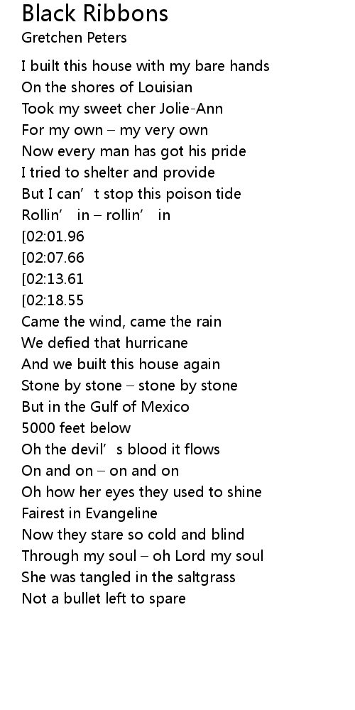 | [01:11.14][02:18.55][03:25.21][03:35.82] | Black ribbons for her hair |