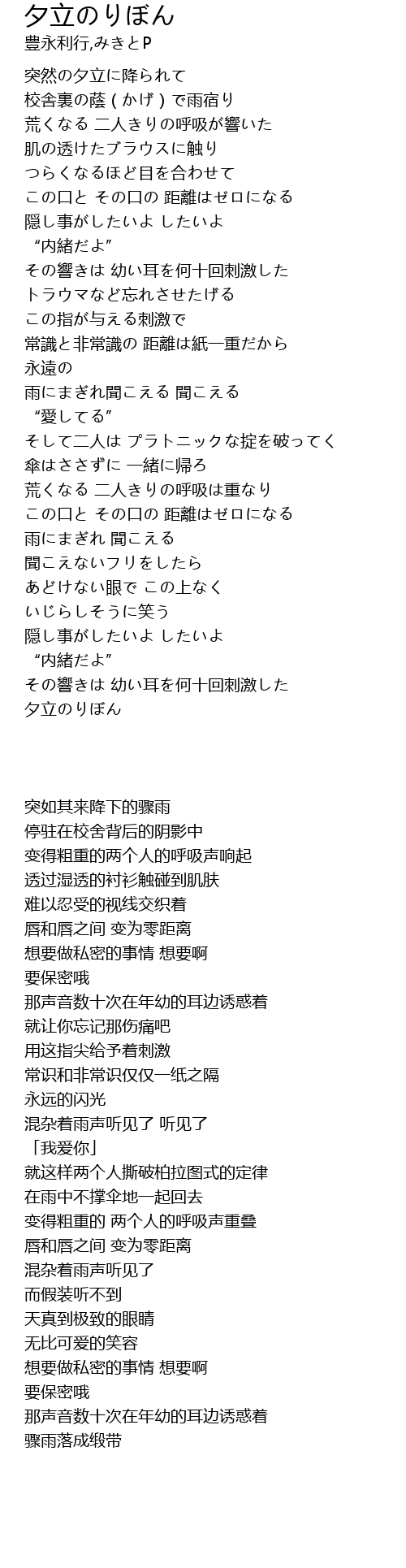 | [00:49.39] | この口と その口の 距離はゼロになる |