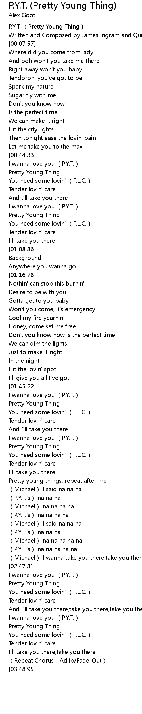| [00:44.93] | I wanna love you P. Y. T. |