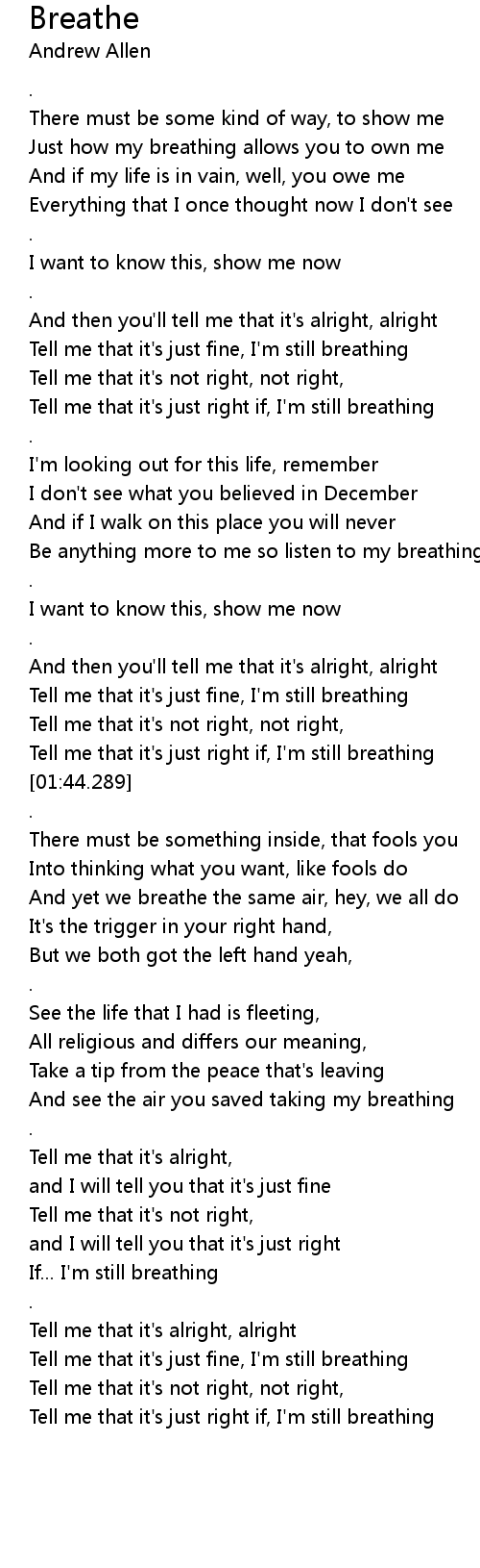 | [00:44.490] | Tell me that it's just fine, I'm still breathing |