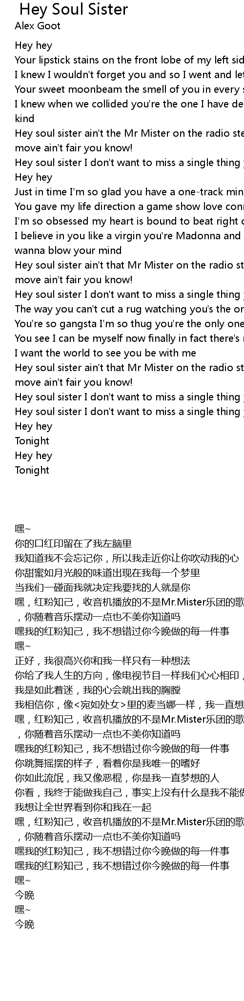 Hey soul sister ain't the Mr Mister on the radio stereo the way you move ain't fair you know! |