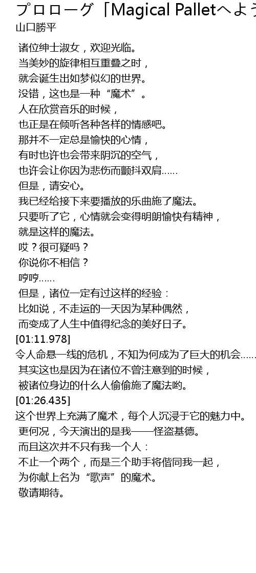 | [01:43.896] | 为你献上名为“歌声”的魔术。 |