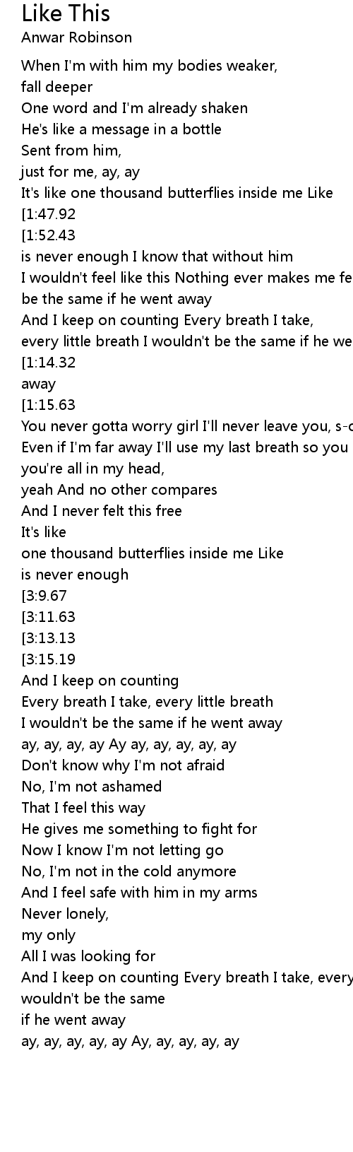 And I keep on counting Every breath I take, every little breath I wouldn't be the same |