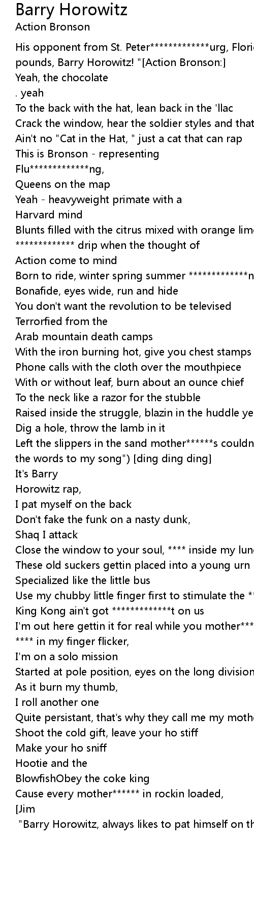 I'm on that old *************t!("Someone took the words to my song") [x2][Jim Ross:] "Barry Horowitz, always likes to pat himself on the back |