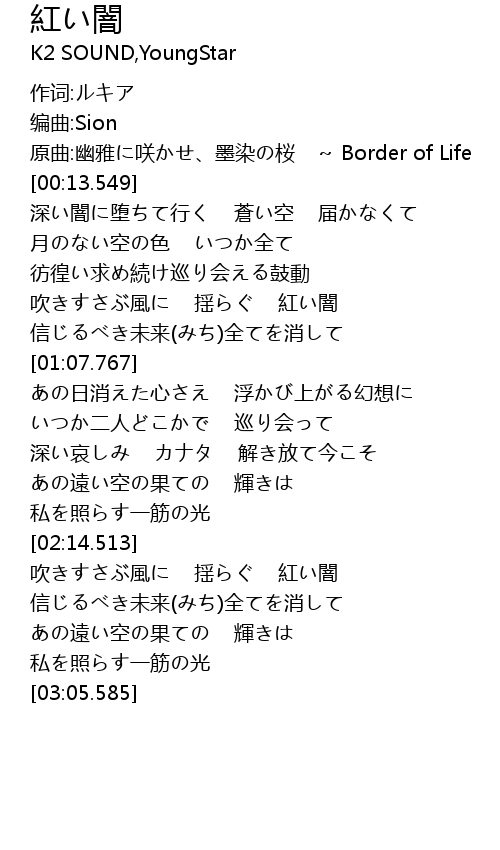 | [02:31.224] | 吹きすさぶ風に 揺らぐ 紅い闇 |