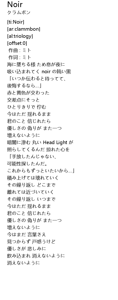 | [00:10.85] | 吸い込まれてく noir の鈍い黒 |