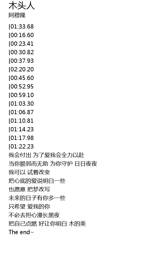 | [02:20.92][00:45.60] | 你说 我对感情 像个木头人 |
