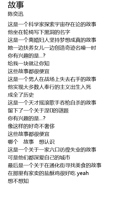 | [02:21.54] | 哪个 故事 想认识 |