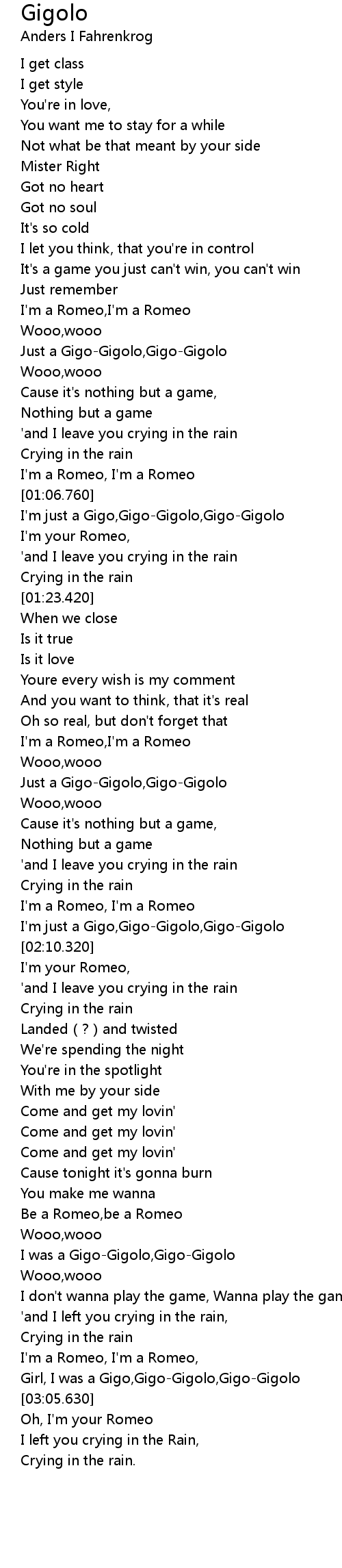 | [03:01.260] | Girl, I was a Gigo, GigoGigolo, GigoGigolo |