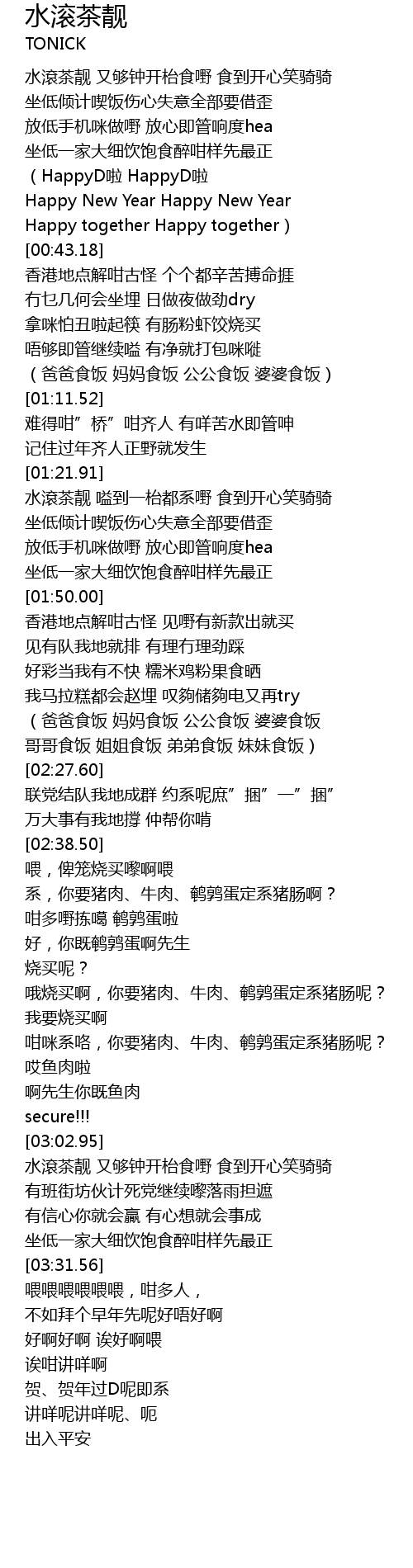 | [03:04.38] | 水滾茶靓 又够钟开枱食嘢 食到开心笑骑骑 |