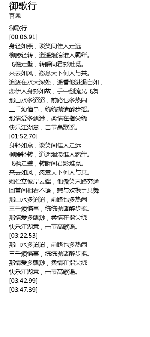 | [03:35.95] | 快乐江湖意,击节高歌谣。 |