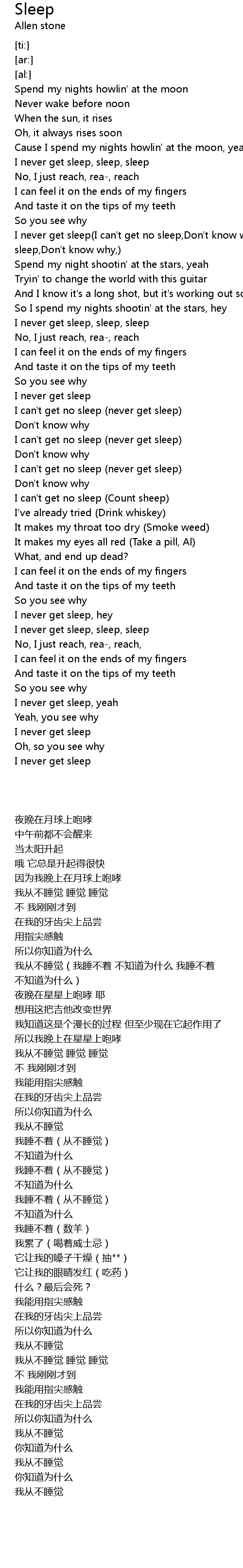 I never get sleep(I can't get no sleep,Don't know why,I can't get no sleep,Don't know why,) |