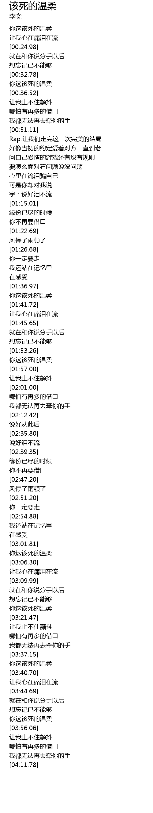 | [00:18.52] | nǐ zhè gāi sǐ de wēn róu |
