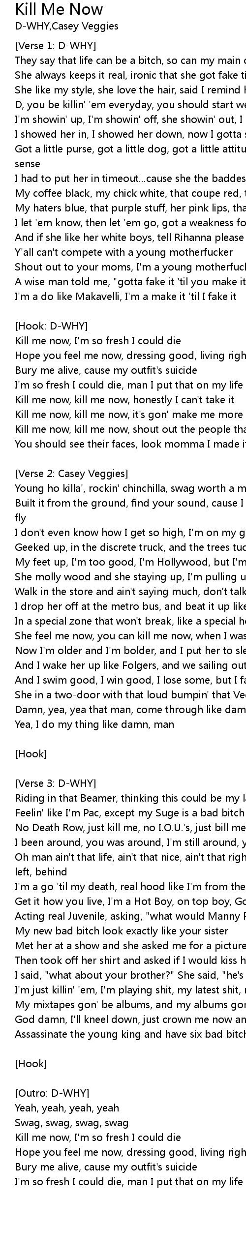 Kill me now, kill me now, shout out the people that I came with |