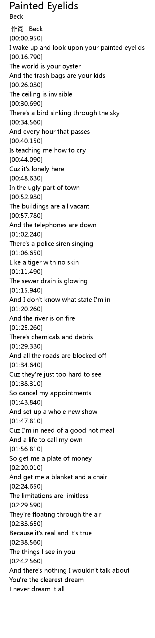 | [00:09.110] | I wake up and look upon your painted eyelids |