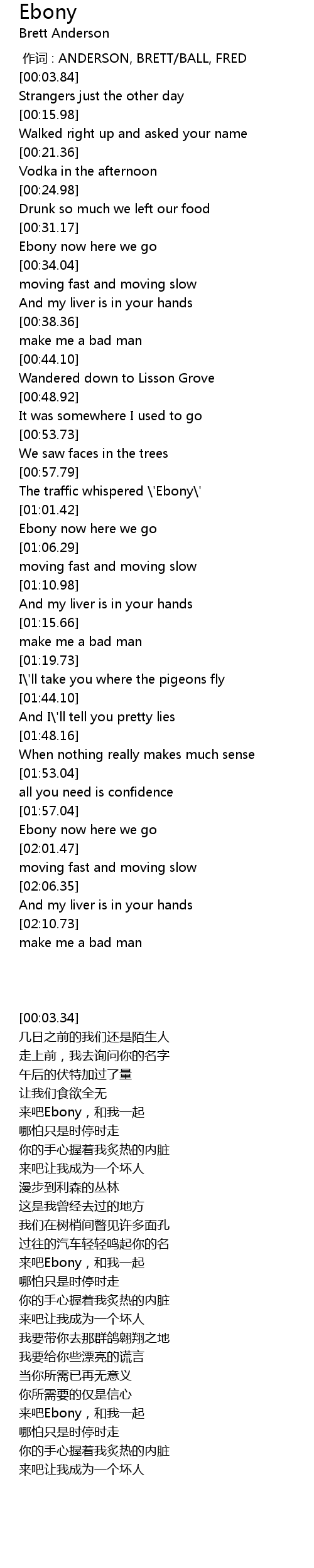 | [01:00.29] | The traffic whispered ' Ebony' |