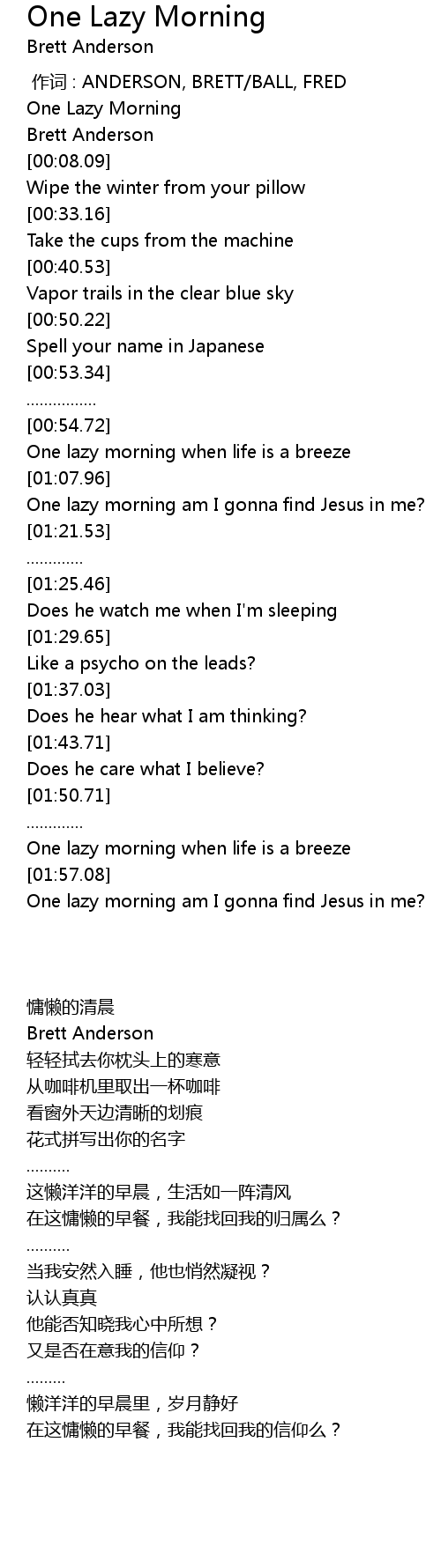 | [01:11.09] | One lazy morning am I gonna find Jesus in me? |