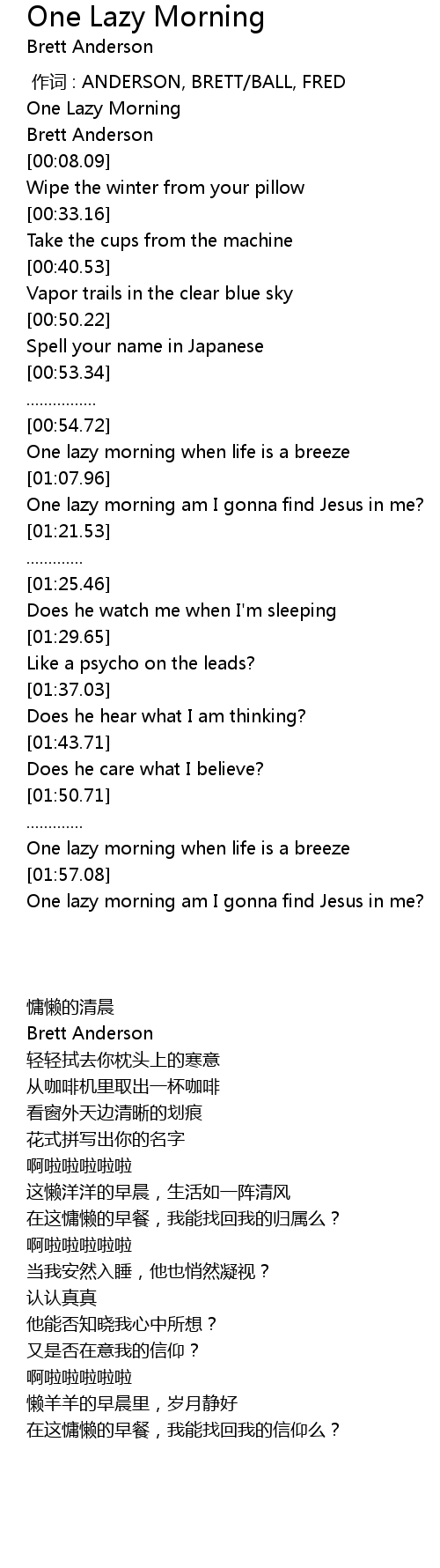 | [01:11.09] | One lazy morning am I gonna find Jesus in me? |