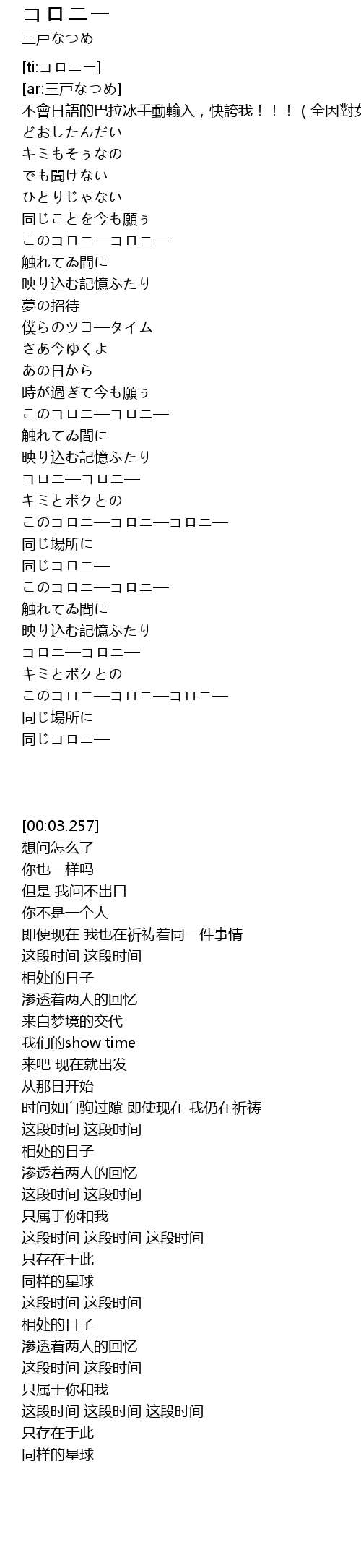 | [03:04.826] | このコロニ—コロニ—コロニ— |