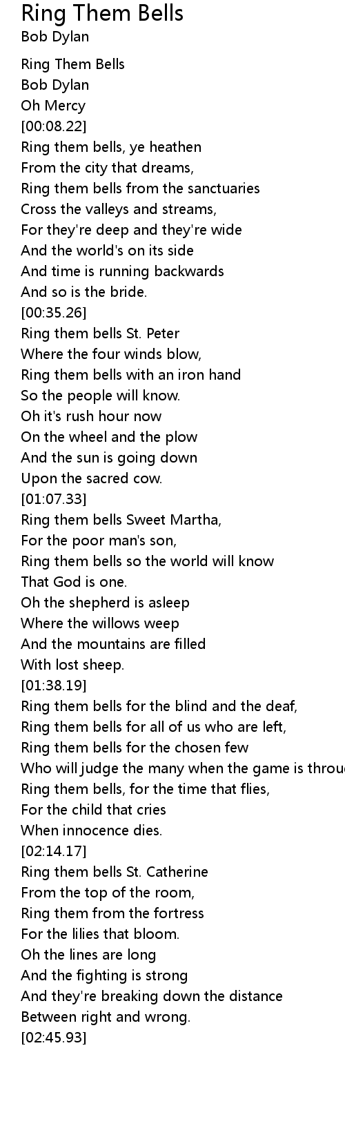 | [01:14.72] | Ring them bells Sweet Martha, |