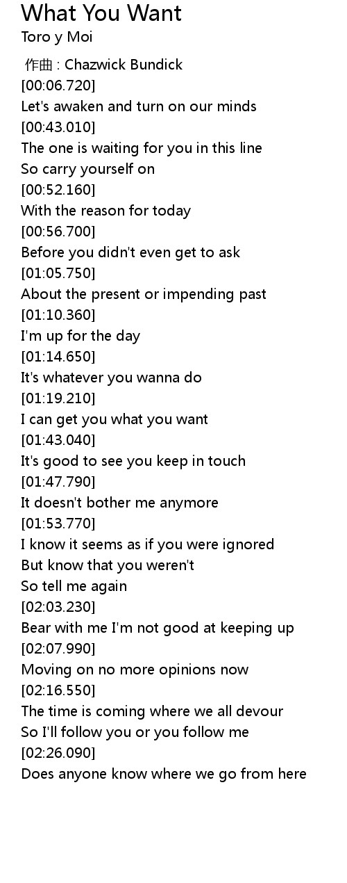 | [02:04.260] | Bear with me I' m not good at keeping up |