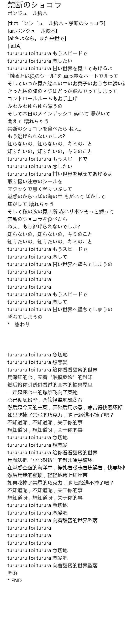 | [03:16.33] | turururu toi turura 甘い世界へ墜ちてしまうの |