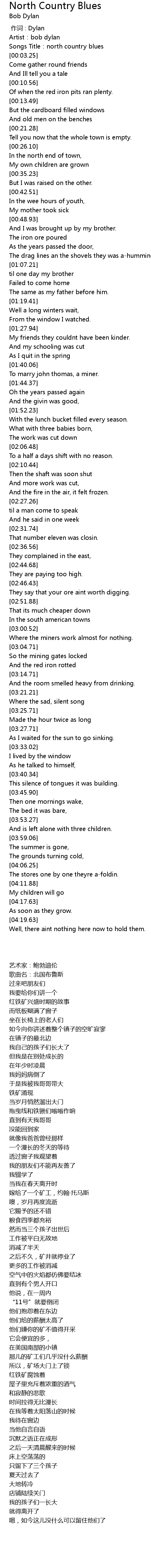 | [00:01.82] | Songs Title: north country blues |
