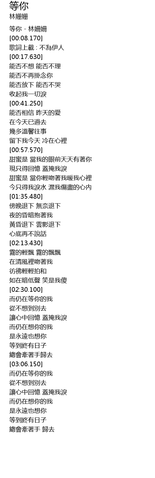 | [00:05.230] | 等你 - 林姍姍 |