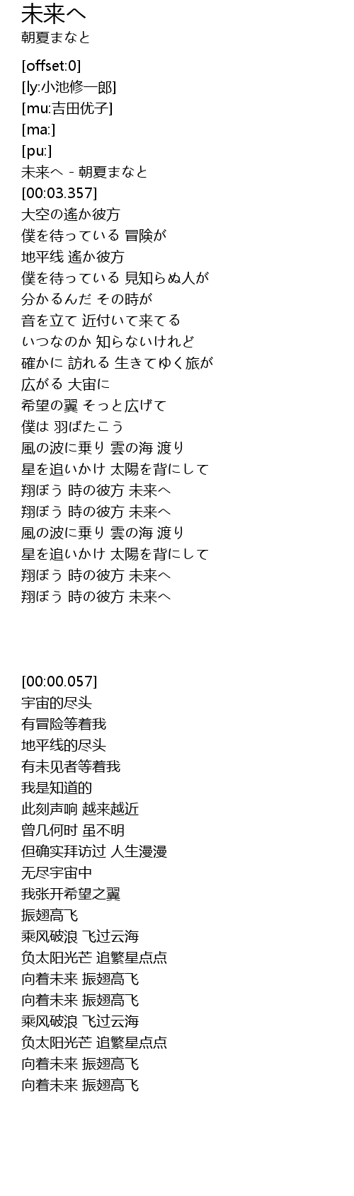 | [00:00.057] | 未来へ - 朝夏まなと |