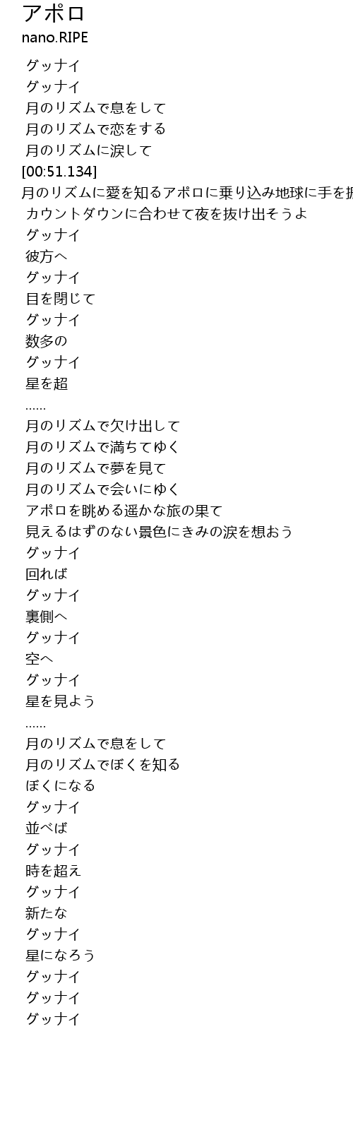| [00:51.134] | 月のリズムに愛を知るアポロに乗り込み地球に手を振って |