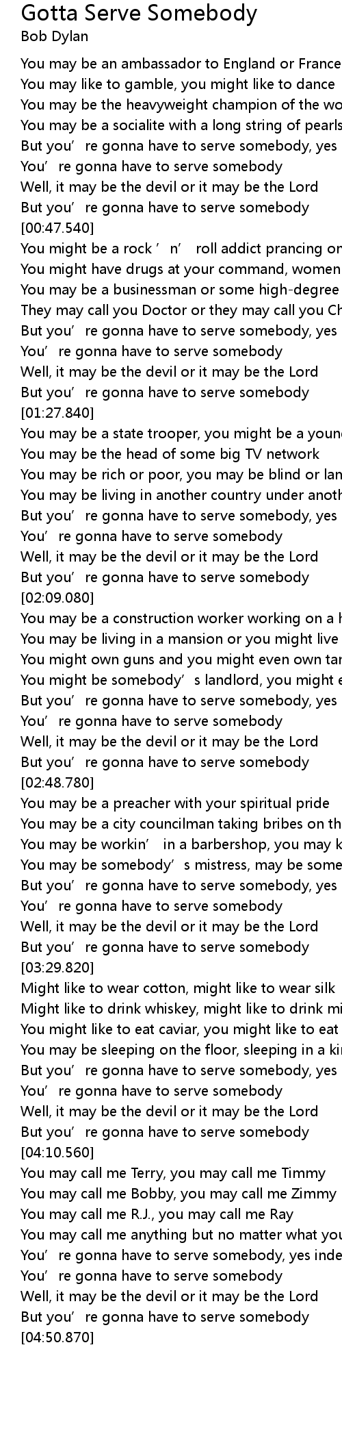 | [03:26.650] | But you' re gonna have to serve somebody |