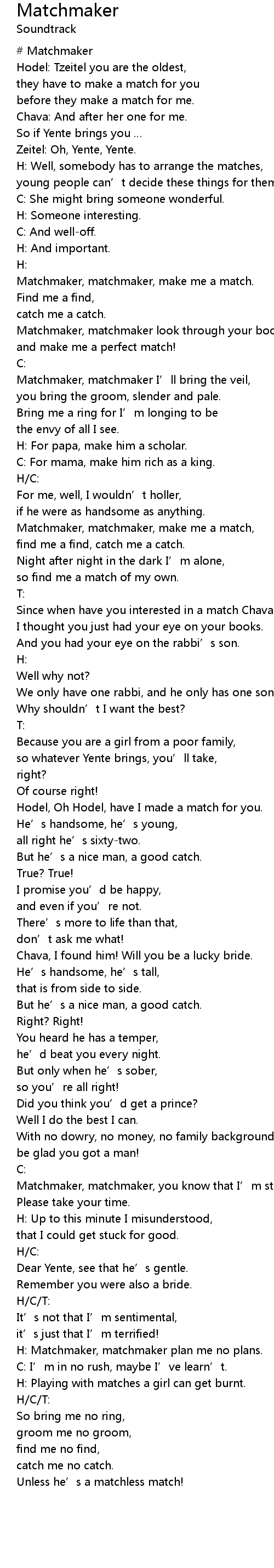 | [00:22.218] | Matchmaker, matchmaker, make me a match. |