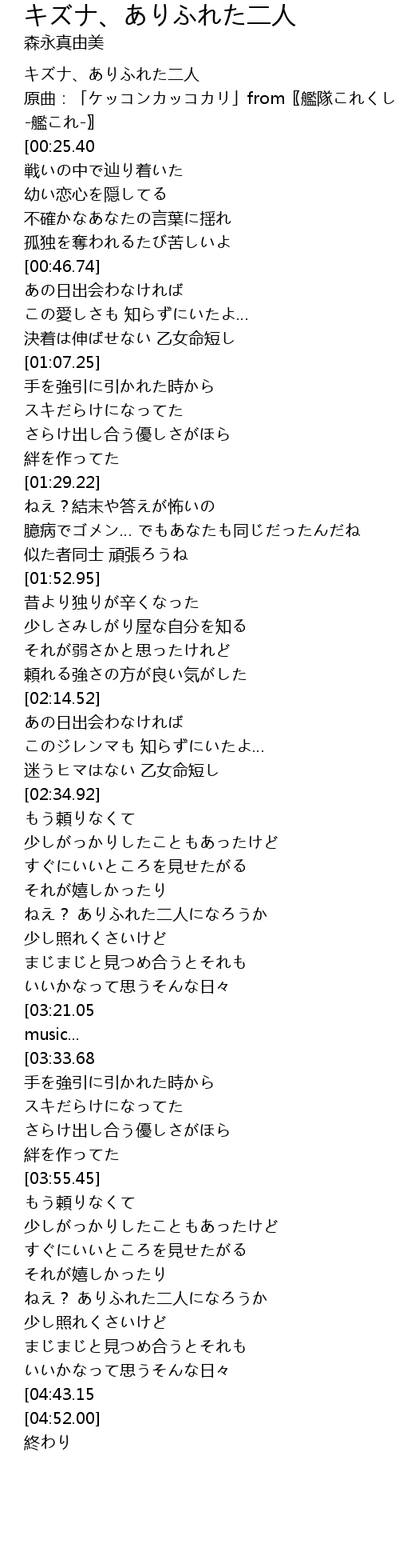 | [00:13.00] | 原曲:「ケッコンカッコカリ」from〖艦隊これくしょん -艦これ-〗 |