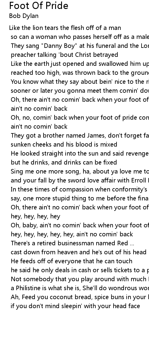 Oh, no, comin' back when your foot of pride come down |