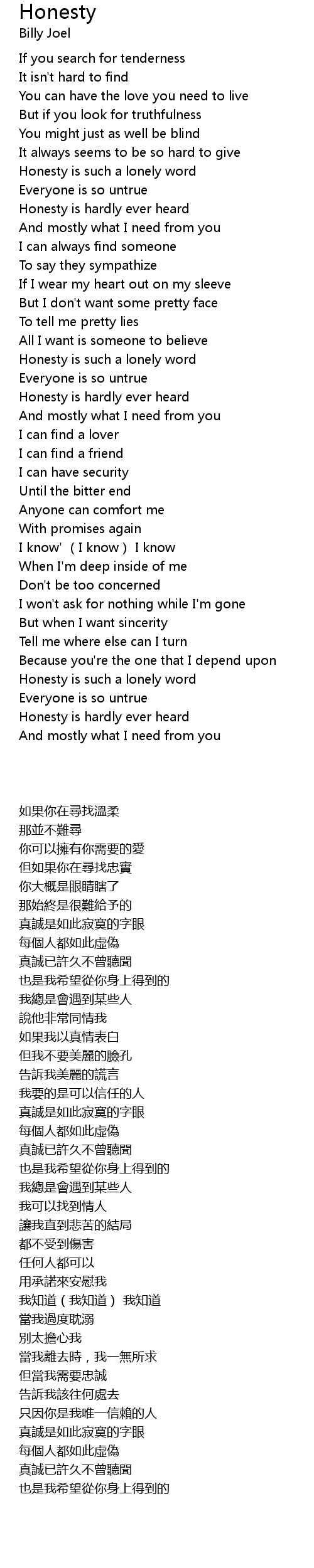 | [00:35.290] | Honesty is such a lonely word |