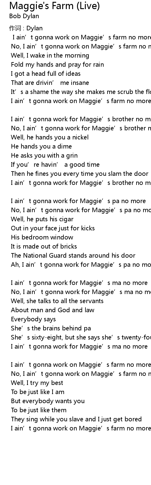 | No, I ain' t gonna work on Maggie' s farm no more | |