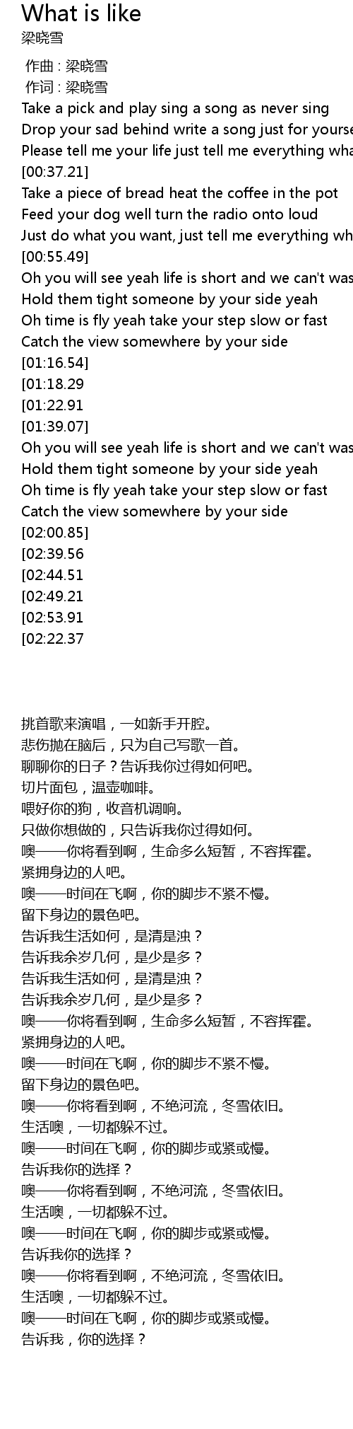 | [00:48.53] | Just do what you want, just tell me everything what is like |