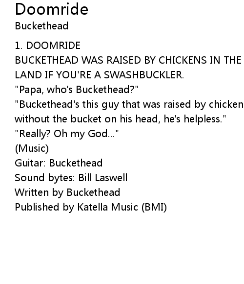 | BUCKETHEAD WAS RAISED BY CHICKENS IN THE COOP. TAKE THE DOOMRIDE INTO BUCKETHEAD LAND IF YOU'RE A SWASHBUCKLER. | |