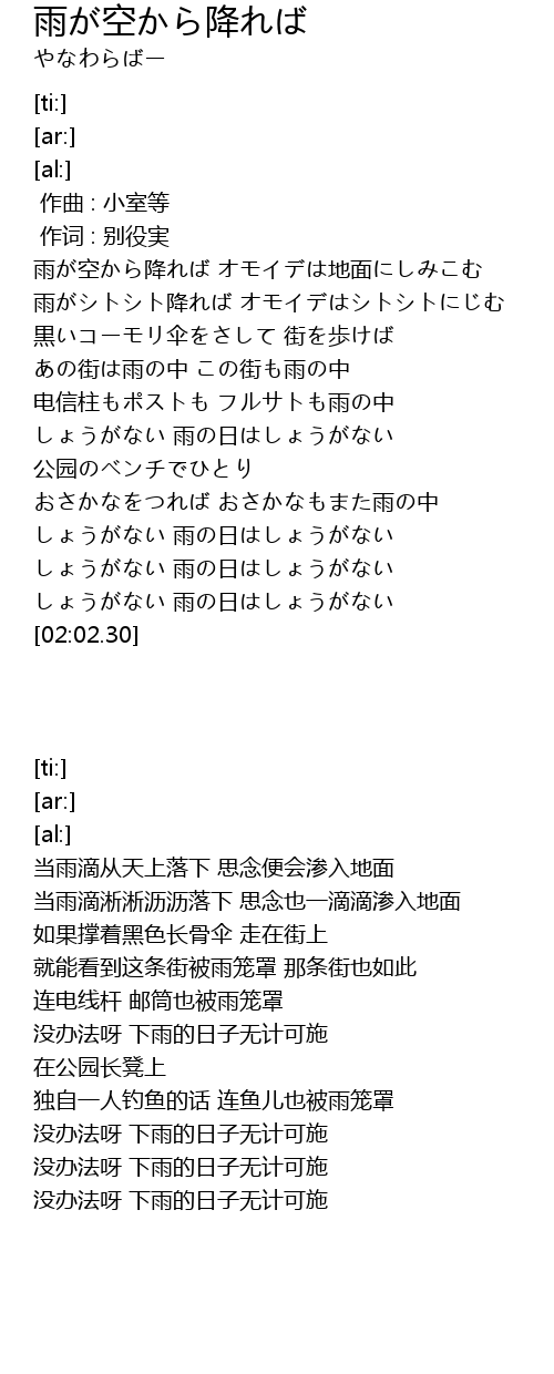 | [00:30.84] | 雨がシトシト降れば オモイデはシトシトにじむ |