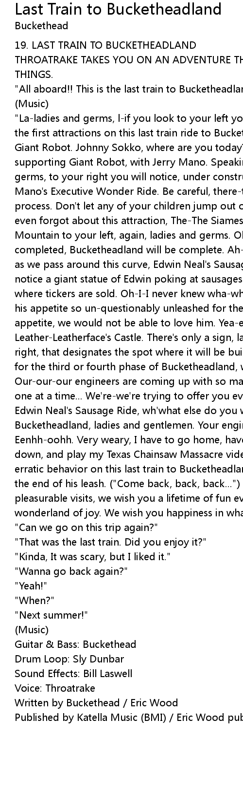 "La-ladies and germs, l-if you look to your left you'll see Giant Robot, one of the first attractions on this last train ride to Bucketheadland. Oh my god, Giant Robot. Johnny Sokko, where are you today? You rode doom for eternity, supporting Giant Robot, with Jerry Mano. Speaking of Jerry Mano, ladies and germs, to your right you will notice, under construction, nearly complete, Jerry Mano's Executive Wonder Ride. Be careful, there-there's still construction in process. Don't let any of your children jump out of the cars. A-huh, oo-o-ah-l even forgot about this attraction, The-The Siamese Twins of Doom, Landslide Mountain to your left, again, ladies and germs. Oh my god, when this is completed, Bucketheadland will be complete. Ah-To your left, to your left again, as we pass around this curve, Edwin Neal's Sausage Massacre Hayride. You'll notice a giant statue of Edwin poking at sausages at the dinnertable. That's where tickers are sold. Oh-I-I never knew wha-wha-what-what- what seemed to make his appetite so un-questionably unleashed for the sausages. But without that appetite, we would not be able to love him. Yea-eah-eah-eaaahh! Leather-Leatherface's Castle. There's only a sign, ladies and gentlemen, to the right, that designates the spot where it will be built. This is will possibly be for the third or fourth phase of Bucketheadland, we're-we're not sure, yet. Our-our-our engineers are coming up with so many ideas! Huh-We can only take 'em one at a time... We're-we're trying to offer you everything we can. Ww-with Edwin Neal's Sausage Ride, wh'what else do you want?!... It's been a long day at Bucketheadland, ladies and gentlemen. Your engineer's getting very weary. Eenhh-oohh. Very weary, I have to go home, have a little phenobarbital, sit down, and play my Texas Chainsaw Massacre video game... Ugh, sorry for the erratic behavior on this last train to Bucketheadland, but, your engineer's at the end of his leash. ("Come back, back, back...") We wish you many more pleasurable visits, we wish you a lifetime of fun even when you're not in this wonderland of joy. We wish you happiness in whatever you do..." |