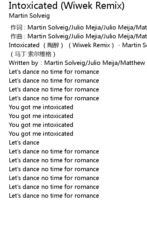 | [00:00.374] | Intoxicated táo zuì Wiwek Remix Martin Solveig mǎ dīng suǒ ěr wéi gé |