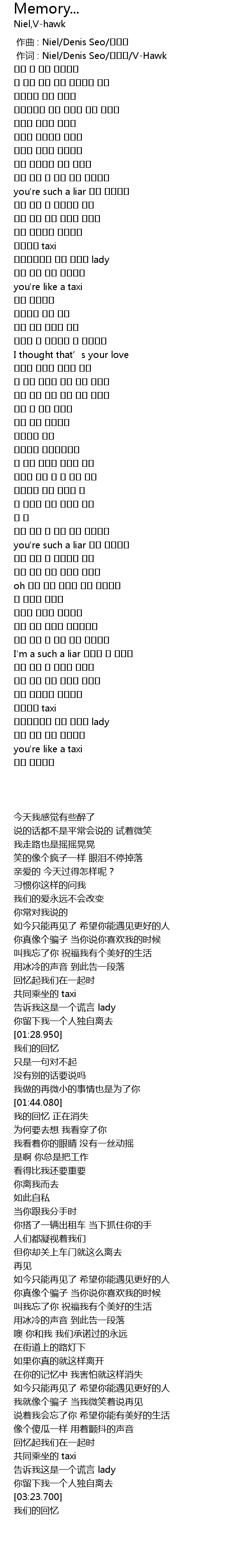 | [00:01.00] | 作词 : Niel/Denis Seo/신승익/V-Hawk |