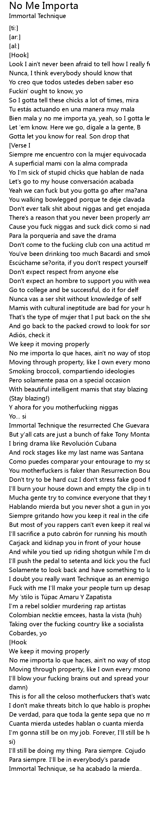 | [03:42.68] | Immortal Technique, se ha acabado la mierda.. |