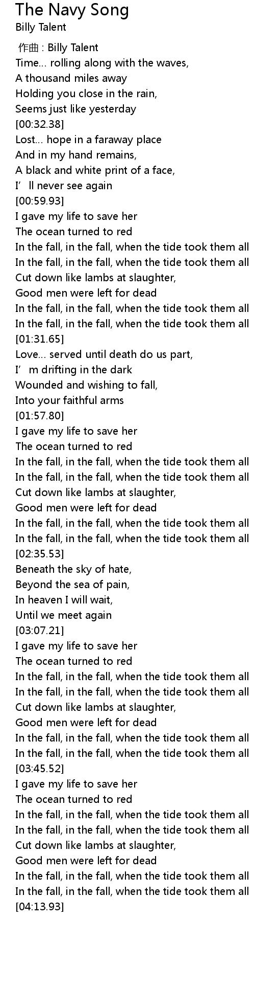 | [03:38.30] | In the fall, in the fall, when the tide took them all |