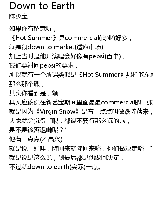 | [00:43.62] | bù guò jiù down to earth shí jì yì diǎn. |