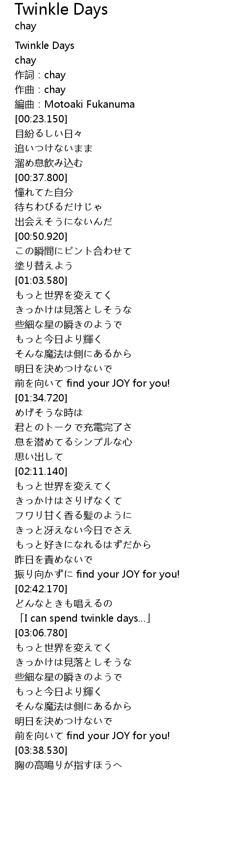 | [03:00.450] | 「I can spend twinkle days…」 |