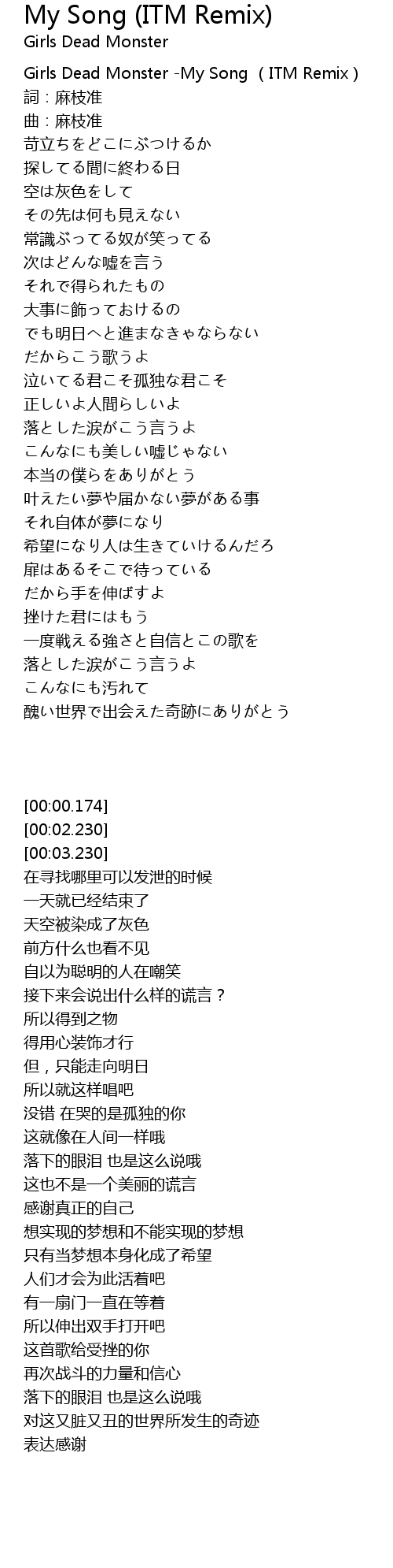 | [00:00.174] | Girls Dead Monster My Song ITM Remix |