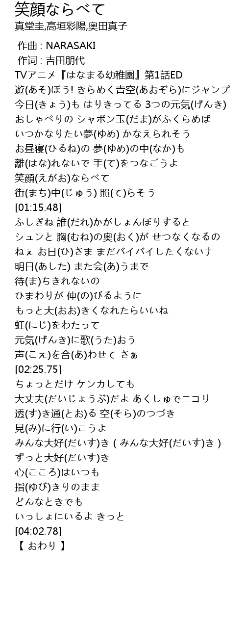 | [01:02.95] | 笑顔(えがお)ならべて |