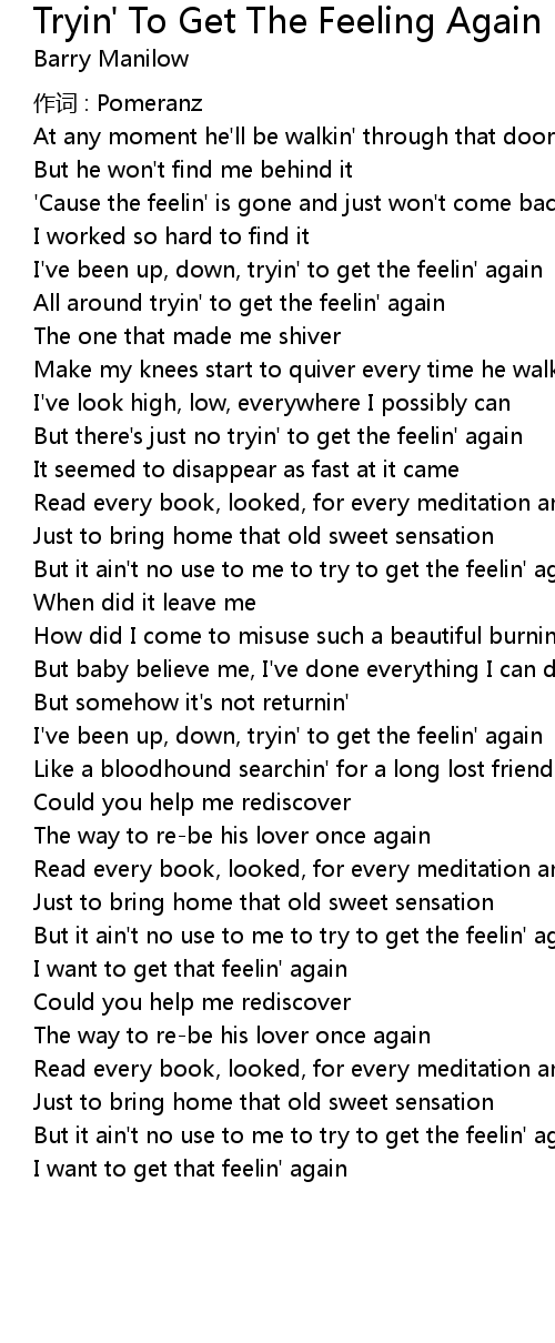 | I' ve been up, down, tryin' to get the feelin' again | |