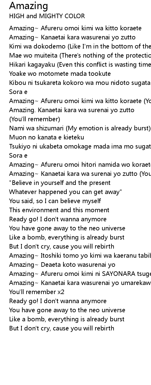 Amazing~ Afureru omoi kimi wa kitto koraete |